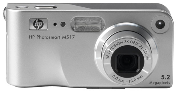 HP Photosmart M517 camera, manual, USB cable, software CD, strap, 2 x NiMh batteries, AC adapter