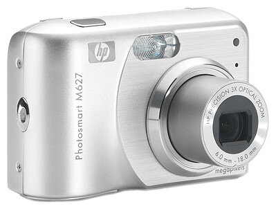 HP PhotoSmart M627 camera, 2 NiMH rechargeable batteries, USB cable, software CD, external charger, strap, instructions