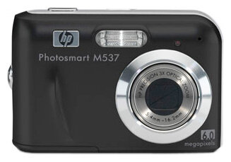 HP Photosmart M537 Camera, 2 AA alkaline batteries, USB cable, strap, software CD, instructions