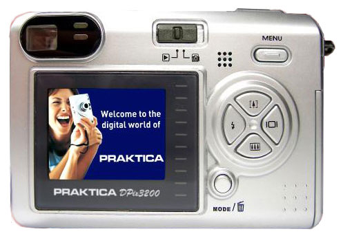 Praktica Dpix3200 camera, 2 AAA batteries, USB cable, strap, pouch, CD-ROM with software, instructions.