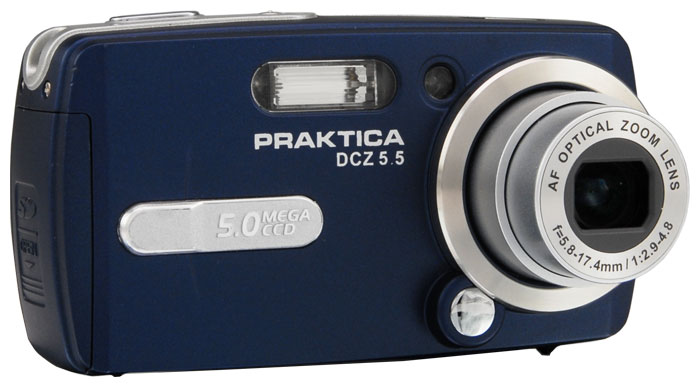 Praktica DCZ 5.5 camera, USB cable, video cable, CD with drivers and software, bag, strap, 2 batteries