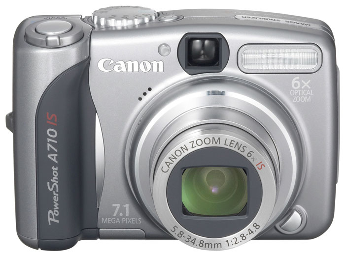 Canon PowerShot A710 IS camera, strap, USB cable, AV cable, 2 x AA batteries, 16MB memory card, software CD, manual