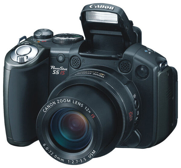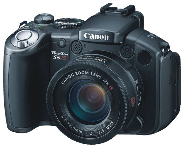 Canon PowerShot S5 IS camera, strap, 4 AA batteries, USB cable, AV cable, 32 MB memory card, software CD, manual