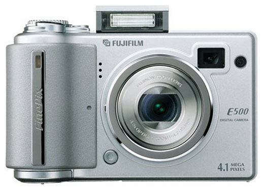 Fujifilm FinePix E500 camera, 16 MB xD-Picture memory card, 2 AA batteries, strap, USB cable, video cable, CD-ROM with software.