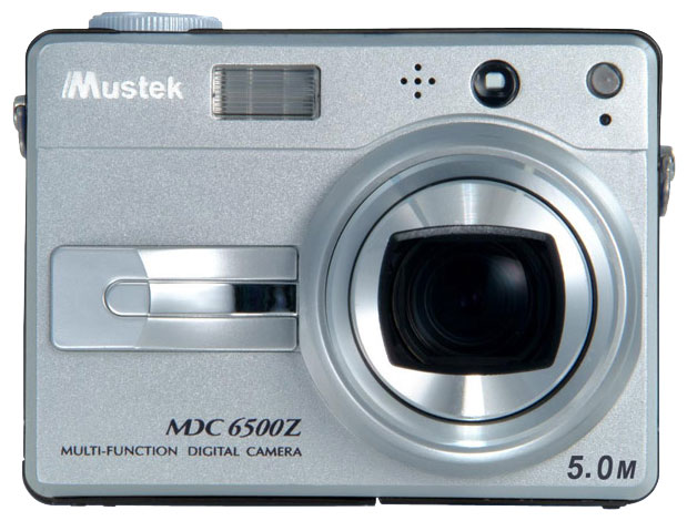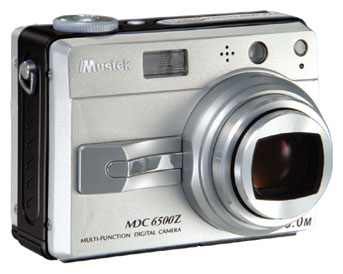Mustek MDC 6500Z camera, Li-ion battery, charger, USB cable, video cable, strap, bag, tripod, CD-ROM with software.