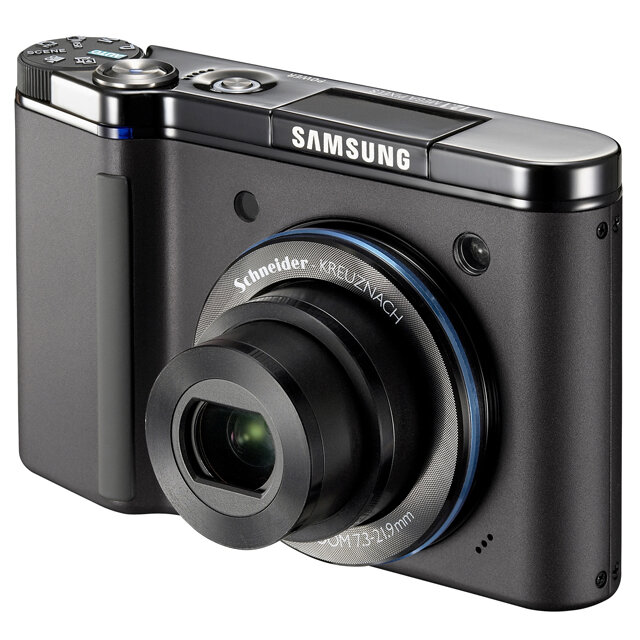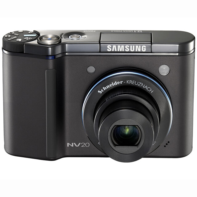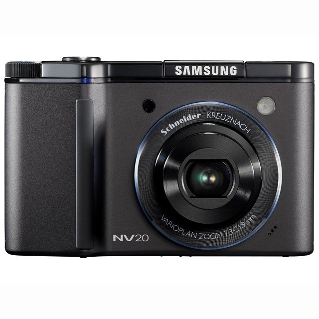 Samsung NV20 camera, SLB-0837B rechargeable battery, SAC-46 AC adapter, SUC-C2 USB cable, AV cable, user manual, warranty card, software CD, camera strap