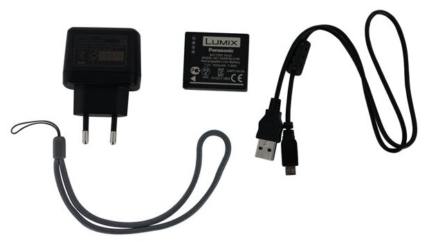 Rechargeable battery, AC adapter, USB cable, camera strap
