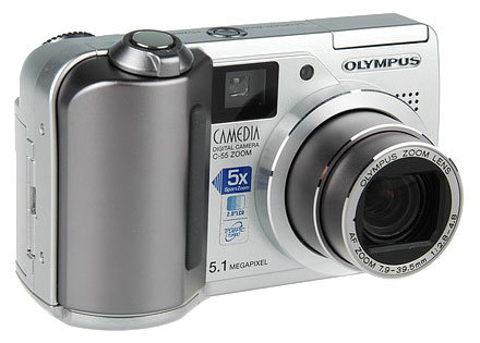 Olympus Camedia C-55 Zoom camera, 4 AA batteries, USB cable, video cable, 16 MB xD-Picture memory card, strap, CD-ROM with software.