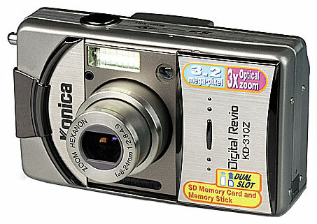 Konica KD-310Z camera, 16 MB MMC memory card, strap, Li-ion battery, mains charger, USB cable, instructions.