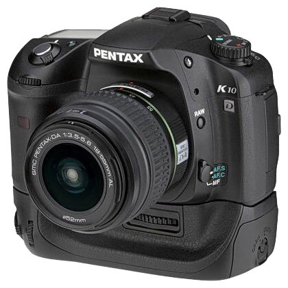 Pentax K10D camera, lens, D-LI50 Li-ion battery, D-BC50 battery charger, USB cable, video cable, power cable, Hot Shoe flash socket FK cap, ME viewfinder cap, camera lens cap, eye