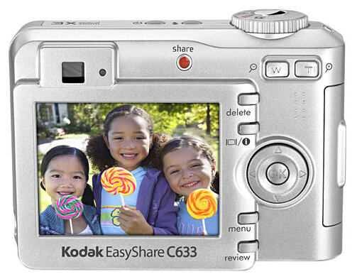 Kodak C633 camera, two AA batteries, USB cable, A/V cable, hand strap, software CD-ROM, instruction manual, warranty card