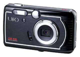 UFO DS55 camera, USB cable, AV cable, bag, strap, 2 AAA batteries, software CD, manual