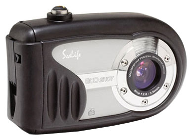 Sealife ECOshot camera, manual, USB cable, software CD, strap, bag, 2 x AA batteries, spare o-ring, water-absorbing capsule, deflector
