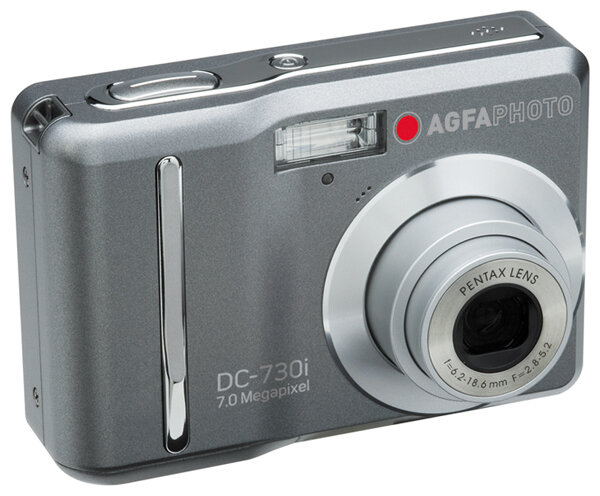 Camera Agfaphoto DC-730i, two AA batteries, USB cable, A/V cable, hand strap, CD-ROM with software, instruction manual, warranty card
