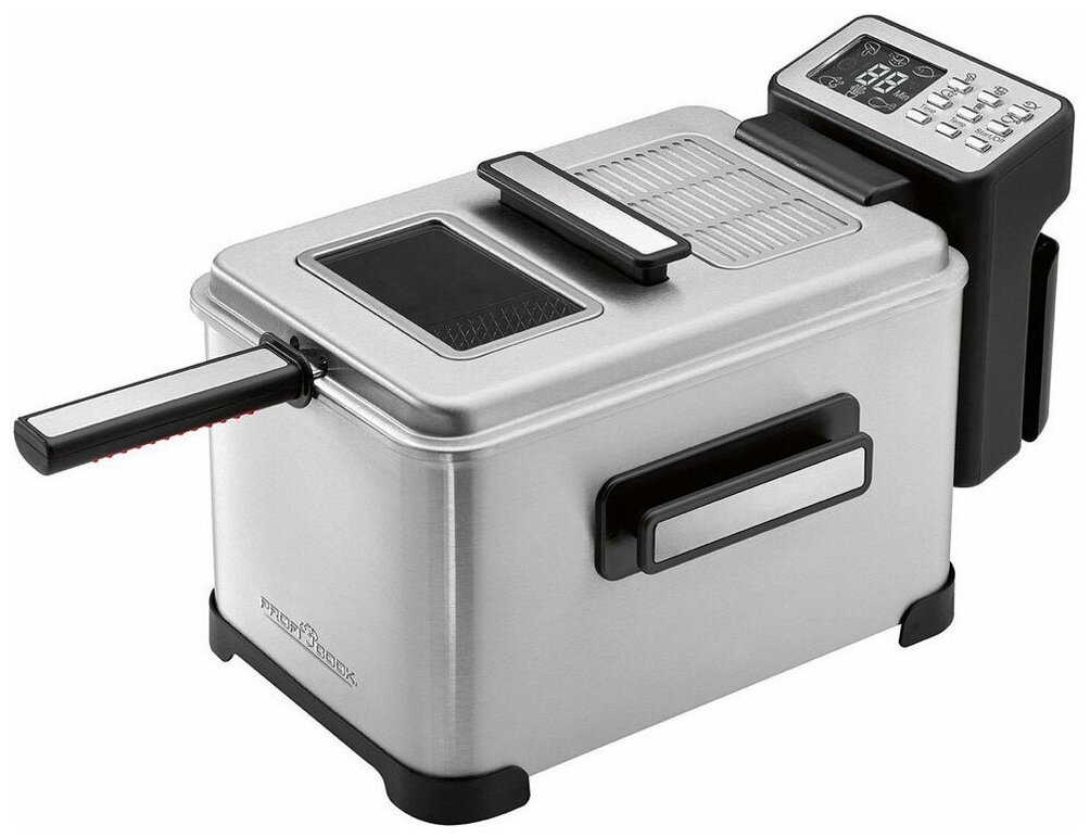 Oil volume: 4 l, body material: stainless steel, power: 2500 W, control: electronic, additional functions: oil temperature adjustment, cold zone, features: cord compartment, viewing window, removable