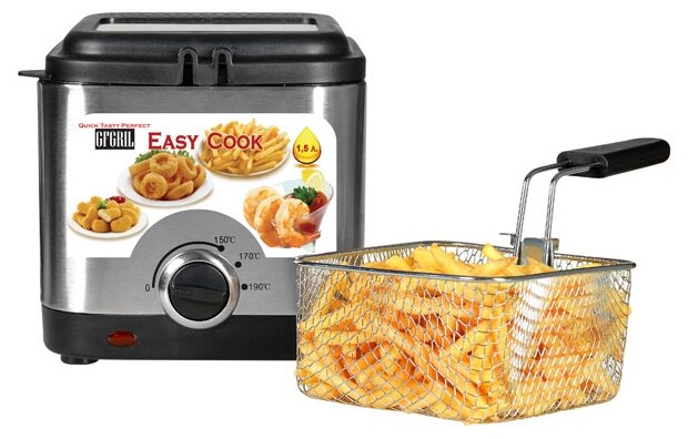 Oil volume: 1.50 l, body material: stainless steel, power: 900 W, control: mechanical, additional functions: oil temperature adjustment, features: lid lock, operation / heating indicator, non-heating