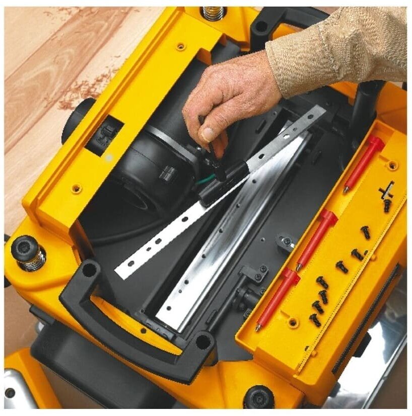 Contents: dust extraction adapter, T-key, depth adjustment rotary knob, hex screw, replacement blade set