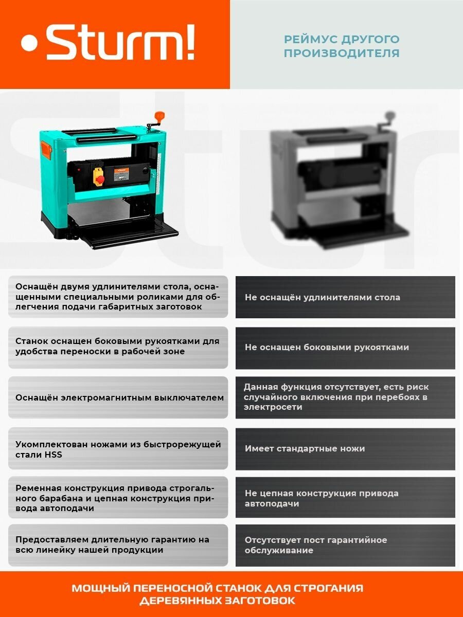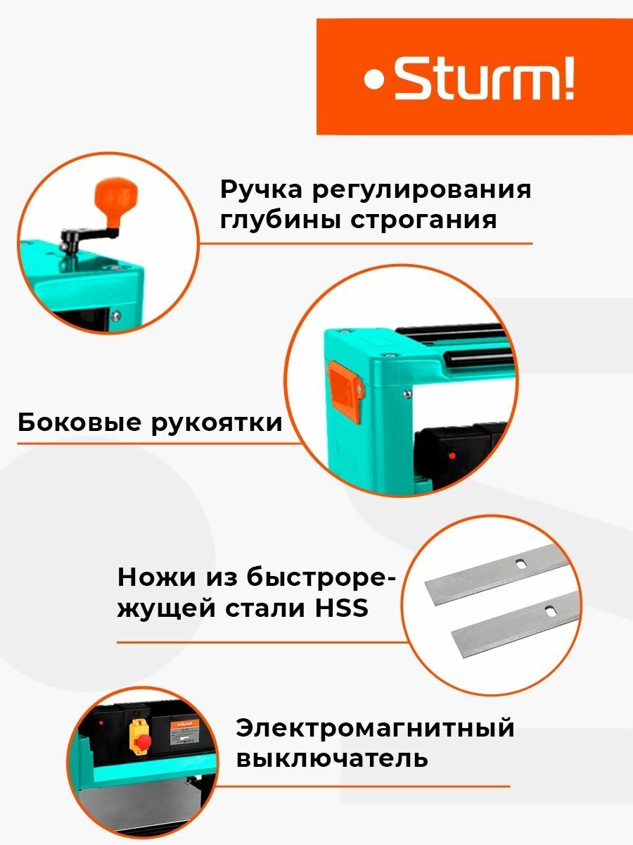 Complete set: thickness gauge, rod of the adjusting mechanism of the protrusion of knives, cutting unit drive handle, rubber feet - 4 pcs., hex key, wrench, instruction manual