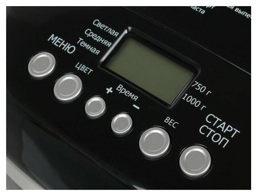 Features: choice of crust color, temperature maintenance, baking weight adjustment, accelerated baking, programs: jam, cake, wheat bread, rye bread, sweet pastries, French baguette, maximum weight of pastries