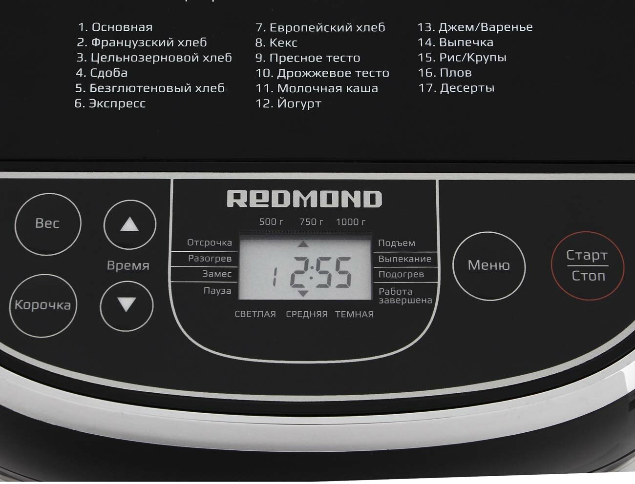 Features: crust color selection, temperature maintenance, baking weight adjustment, removable lid, timer, accelerated baking, Display, cooking time adjustment, temperature adjustment, programs: gluten-free