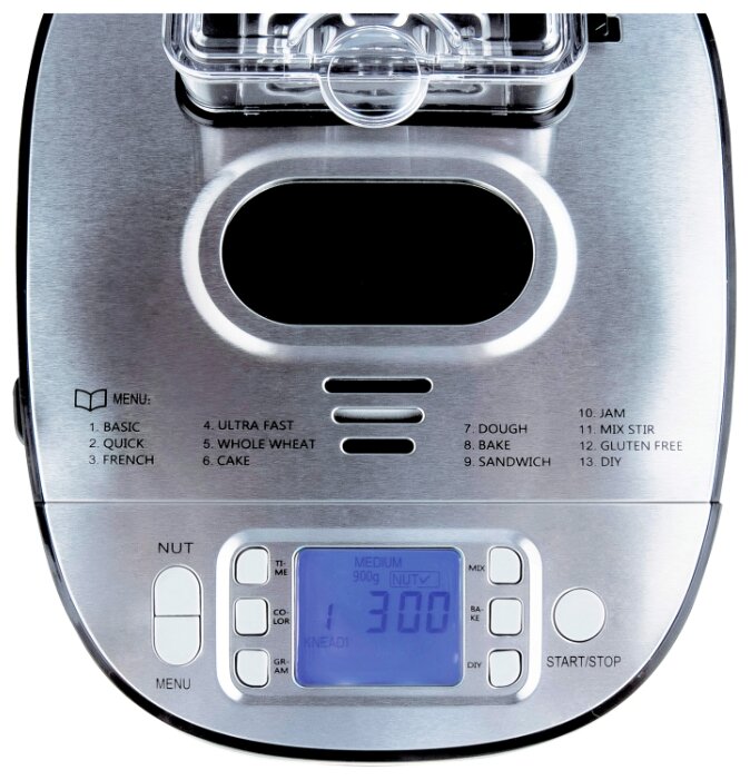 Features: crust color selection, dispenser, temperature maintenance, user mode, baking weight adjustment, timer, accelerated baking, programs: gluten-free baking, dough kneading, cake, wheat bread, f