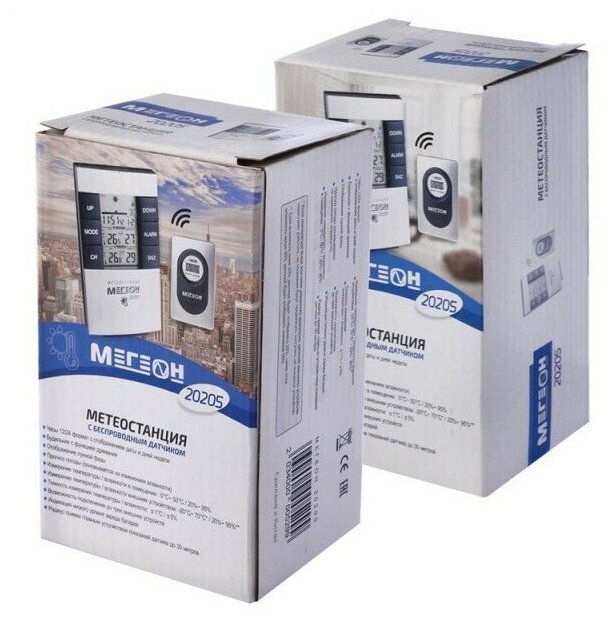 Type: weather station, measurements: indoor humidity, outdoor humidity, indoor temperature, outdoor temperature, additional functions: alarm clock, calendar, weather forecast, clock, remote sensor type: wireless