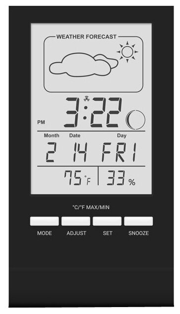 Type: weather station, measurements: indoor humidity, indoor temperature, additional functions: alarm clock, calendar, weather forecast, clock, setting: desktop