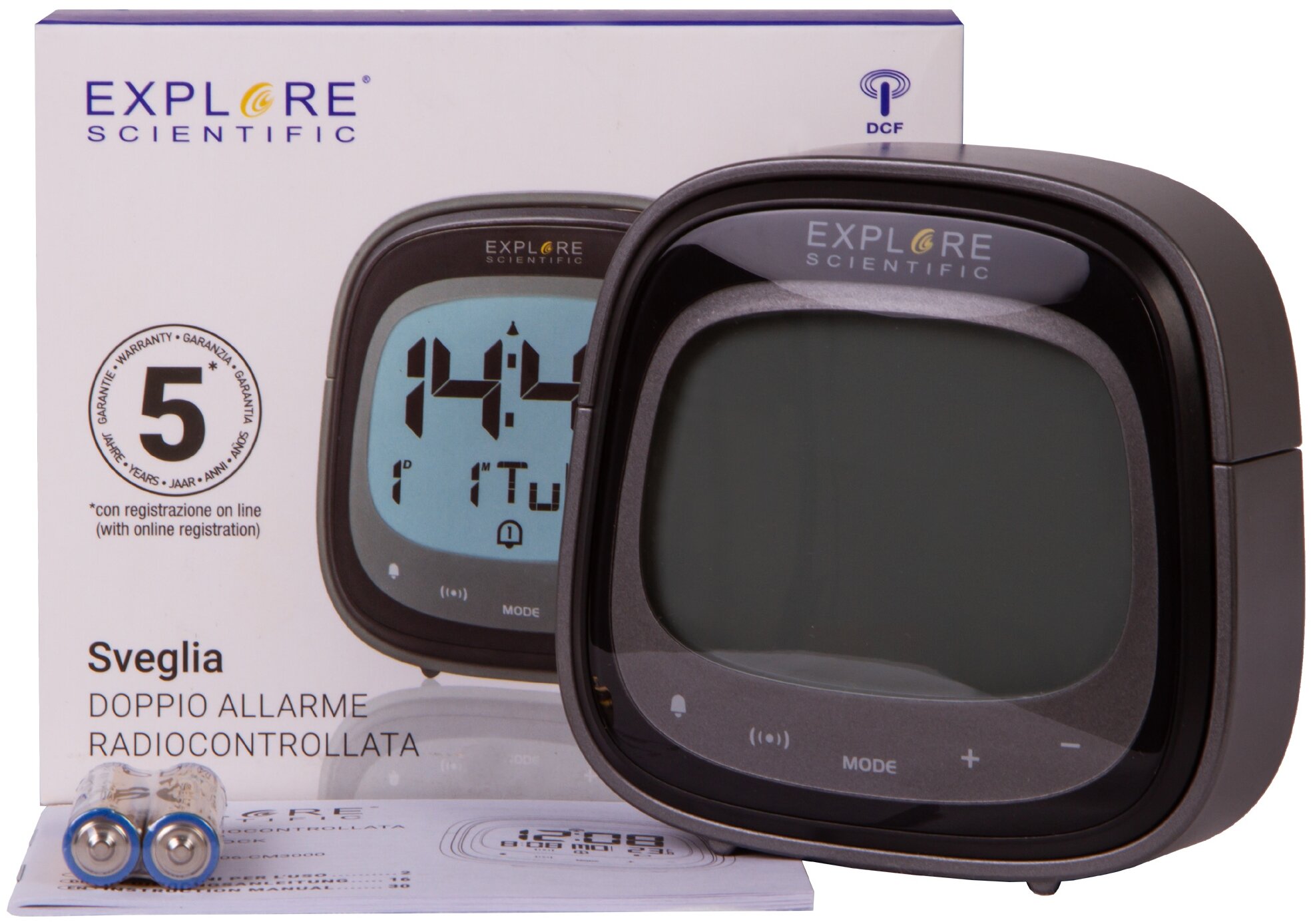 Batteries included; touch control buttons; features: two alarms, snooze function