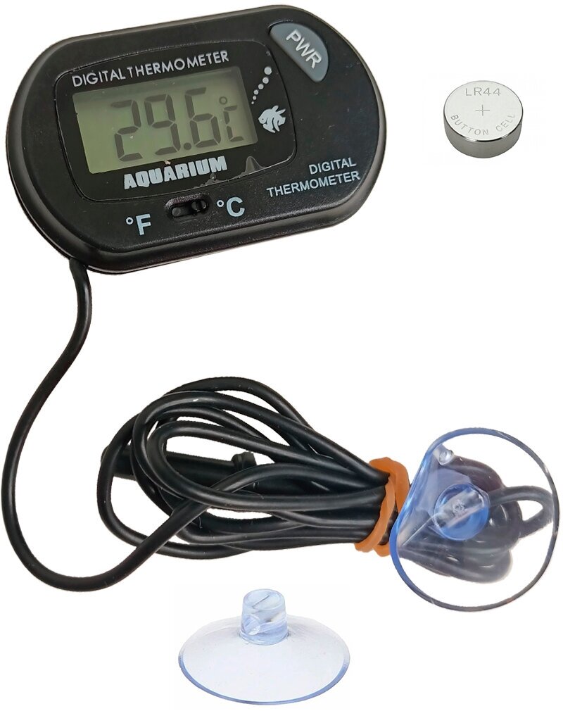 Type: Aquarium thermometer, measurements: indoor temperature, outdoor temperature, aquarium, installation: on a smooth surface with a suction cup