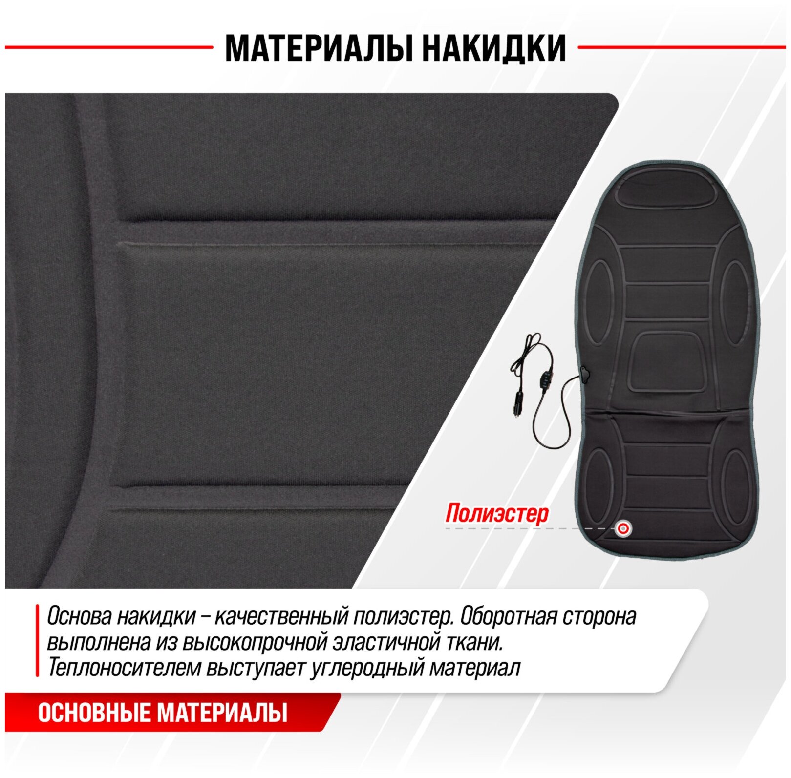 Type: cape, purpose: on the headrest, on the seat, on the back, car model: any, material: polyester, functions: heating, number of seats: 1, seat location: rear, front, fastening: hooks, rubber bands