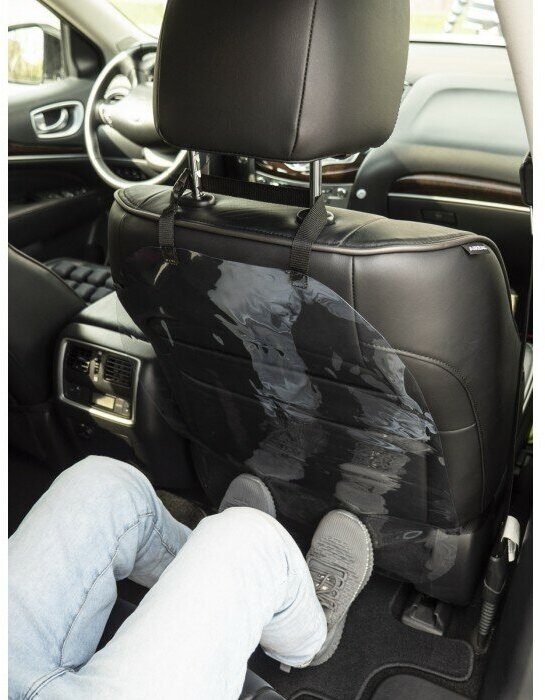 Made of thick PVC film 500 microns 0.5 mm, fastened to the headrest and at the base of the seat with plastic fastexes; fastening from below has strap adjustment depending on the thickness of the seat profile