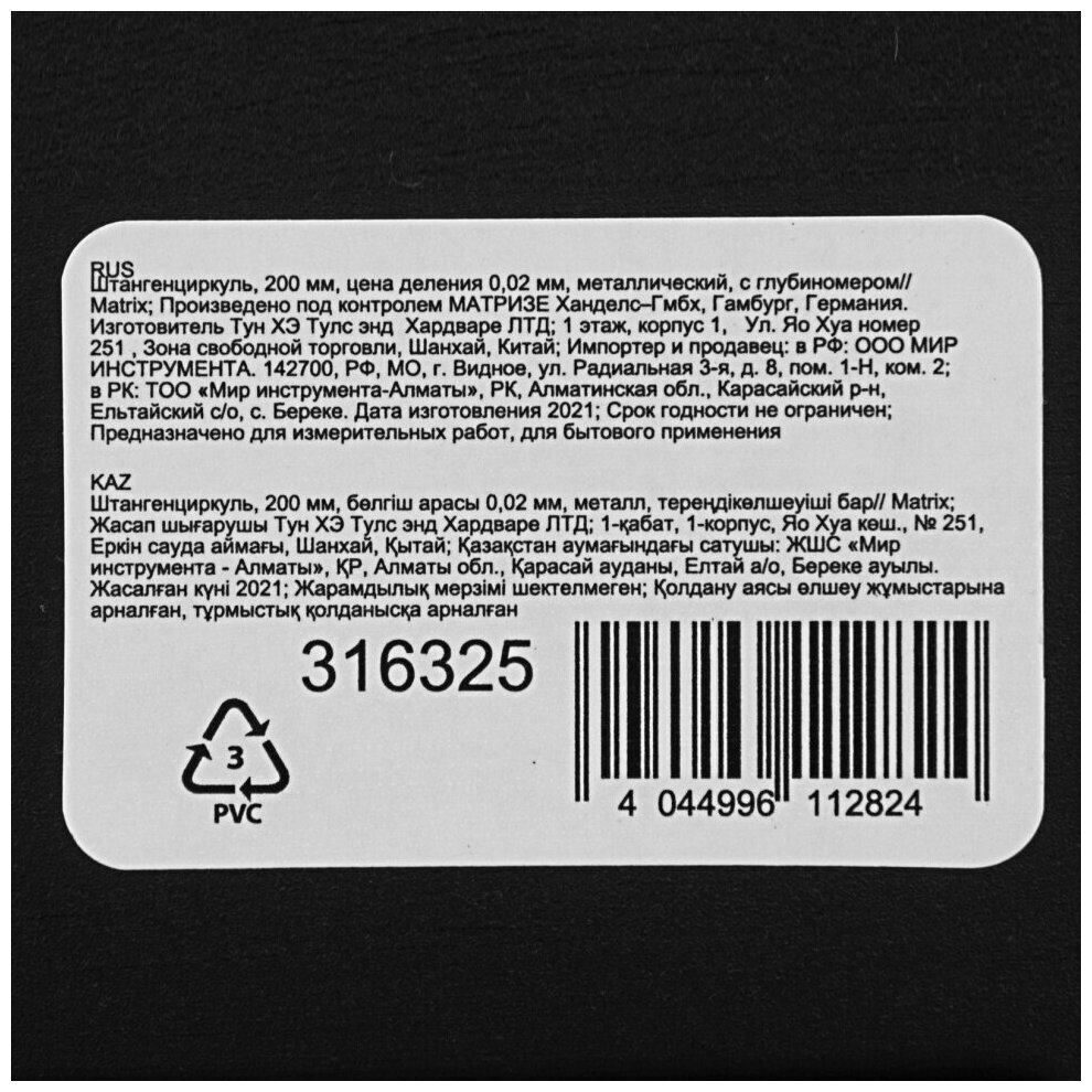 Instrument type: vernier caliper, type: vernier, length: 200 mm, maximum measurement value: 200 mm, graduation: 0.02 mm