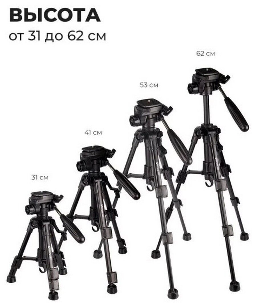 Design: tripod, scope: for photo and video cameras, maximum shooting height: 61.80 cm, head type: 3D, options and kit: head included, bag hook, interchangeable platform, removable head, level, case in