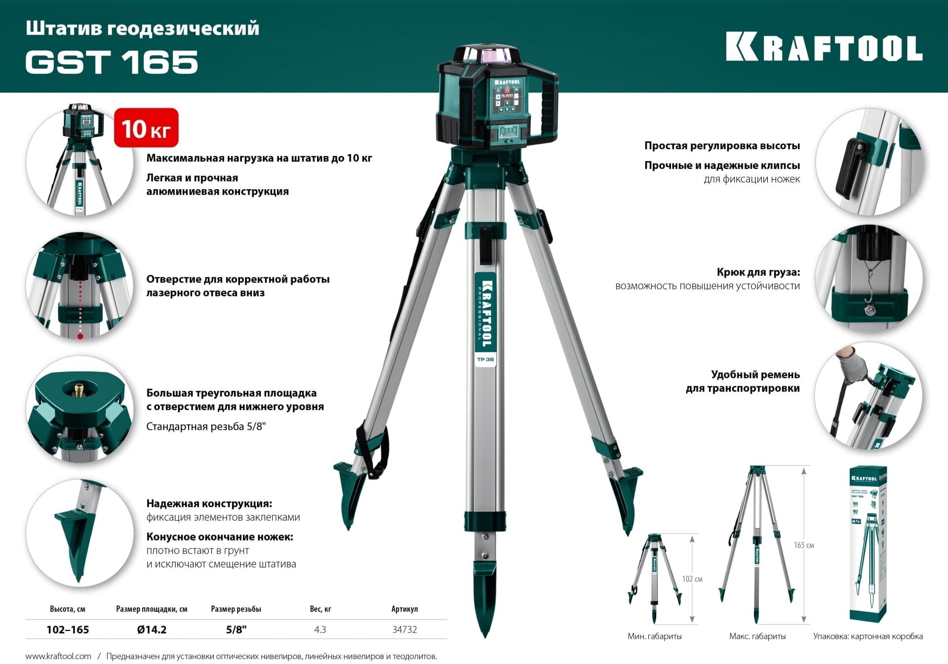 Type: tripod, purpose: for laser level, length: 1650 mm, tripod features: folding design, telescopic, device thread: 5/8", package contents: case