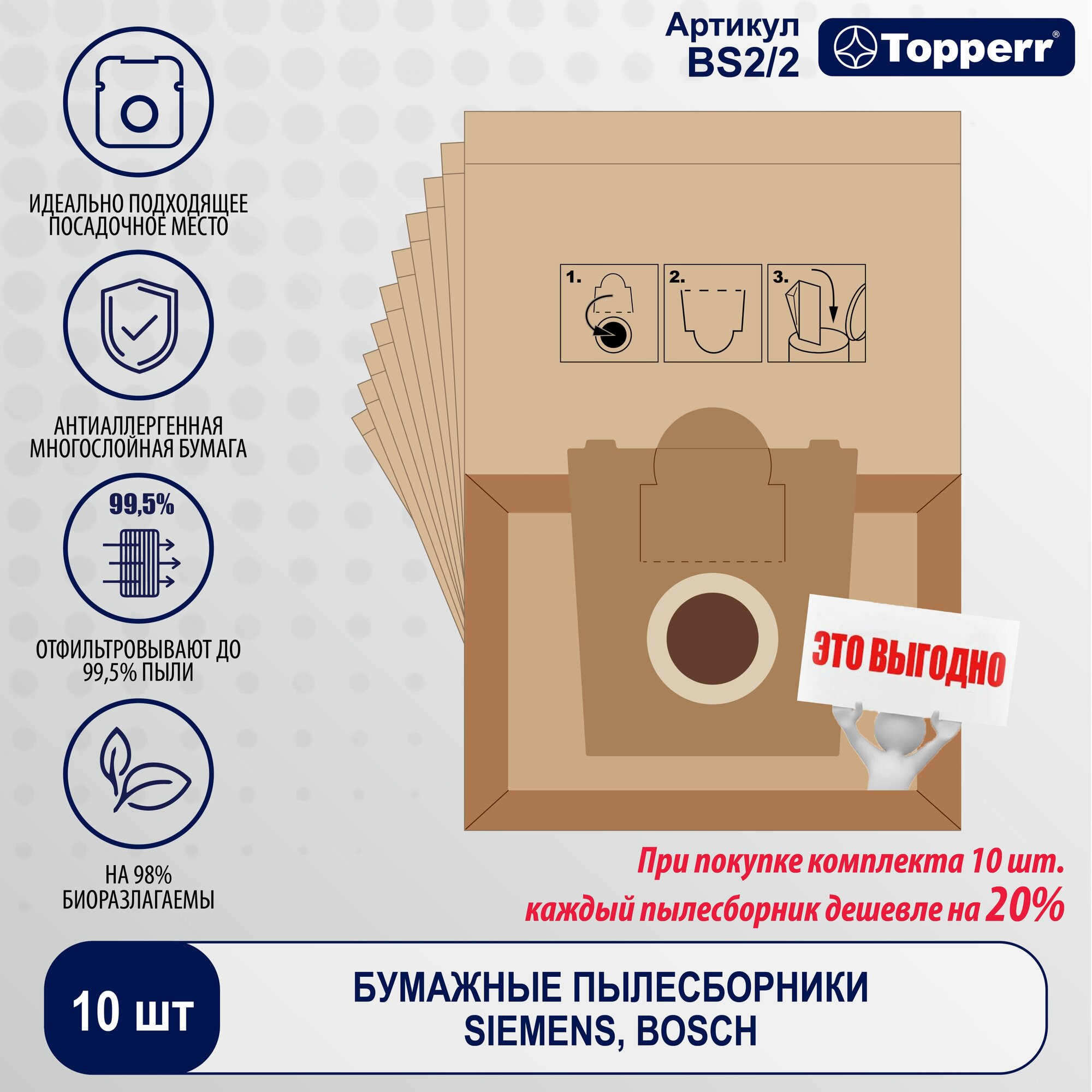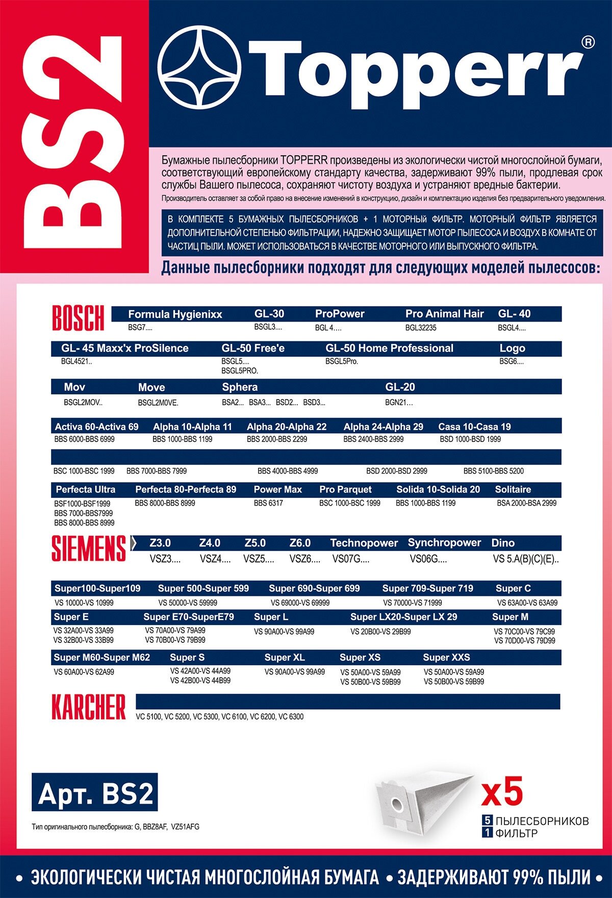 Vacuum cleaner manufacturer: Bosch, Siemens, accessory type: dust collector, filter, material: paper, features: for pet owners, length: 11 cm, width: 18 cm, height: 25 cm