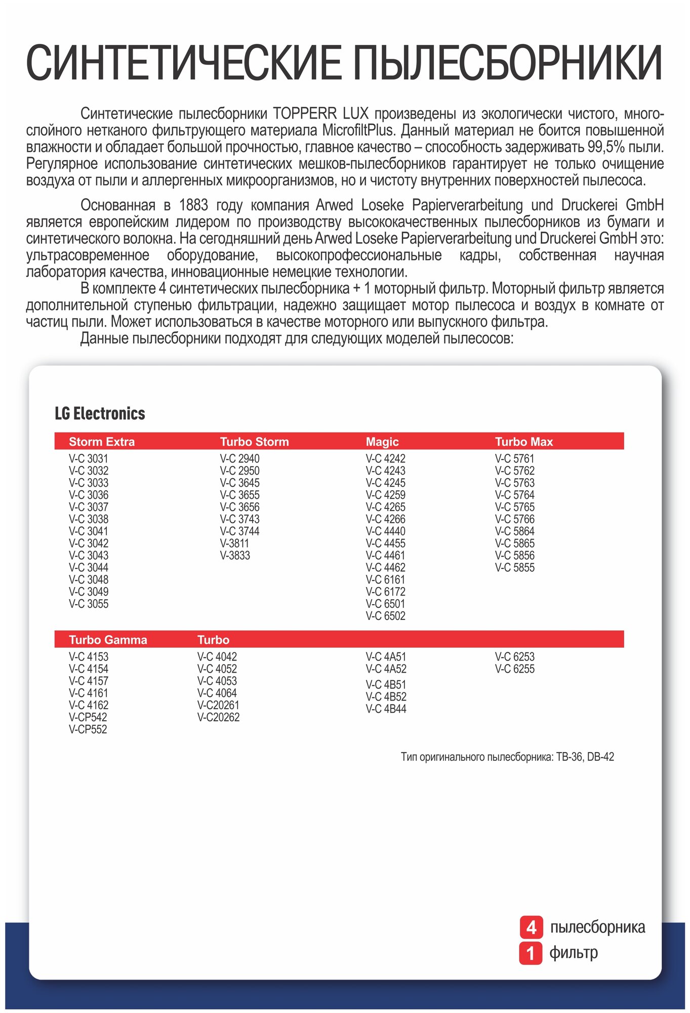 LG ELECTRONICS: Storm Extra: V-C 30..; Turbo Storm: V-C 29.., V-C 36.., V-C 374., V-38..; Turbo Gamma: V-C 41.., V-CP5..; Magic: V-C 42.., V-C 44.., V-C 61.., V-C65..; Turbo Max V-C 57.., V-C 58..; Turbo V-C 40.., V-C202; V-C 62..; V-C 4A..; V-C 4B..
