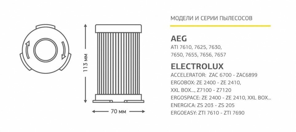 AEG: ATI 76**; Electrolux Accelerator: ZAC 6700 - ZAC6899, Ergobox: ZE 2400 - ZE 2410, XXL BOX... , Z7100- Z7120, Ergospace: ZE 2400 - ZE 2410, XXL BOX..., Energica: ZS 203 - ZS 205, Ergoeasy: ZTI 7610- ZTI 7690