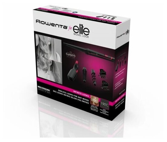 Set includes: conical curling head, protective glove, tongs and straightening plates, spiral brush, plastic brush, 2 wire cutters, handle, case