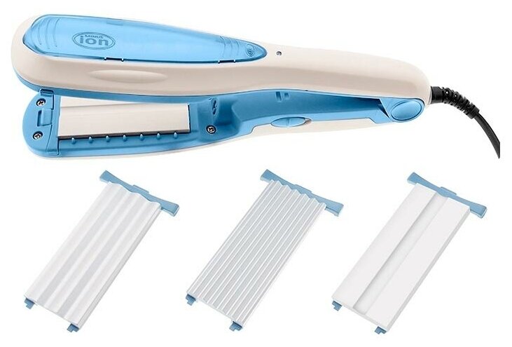 Type: tongs, purpose: straightening, corrugation, additional functions: ionization, power: 50 W, features: cord rotation, teeth on the straightening nozzle, on indication, ready to work indication, nozzles
