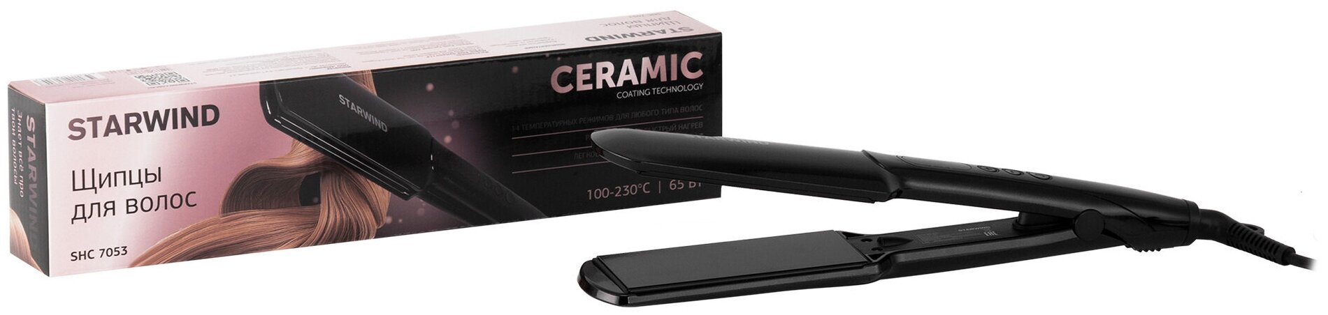 Type: rectifier, coating: tourmaline ceramic, purpose: straightening, additional functions: ionization, maximum heating temperature: 230 °C, power: 65 W, features: display, power-on indication, loop for
