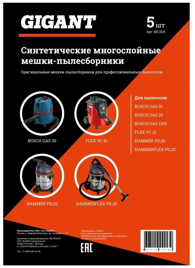 Bags of professional vacuum cleaners 5 pcs. 20 l Gigant BH 20/5 Russia