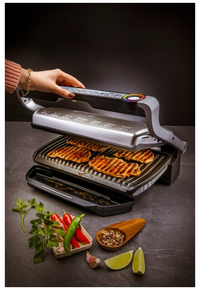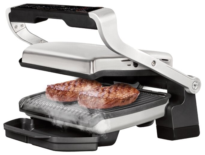 Non-stick coating, contact grill, drip tray, top panel height adjustment, grid, carrying handle