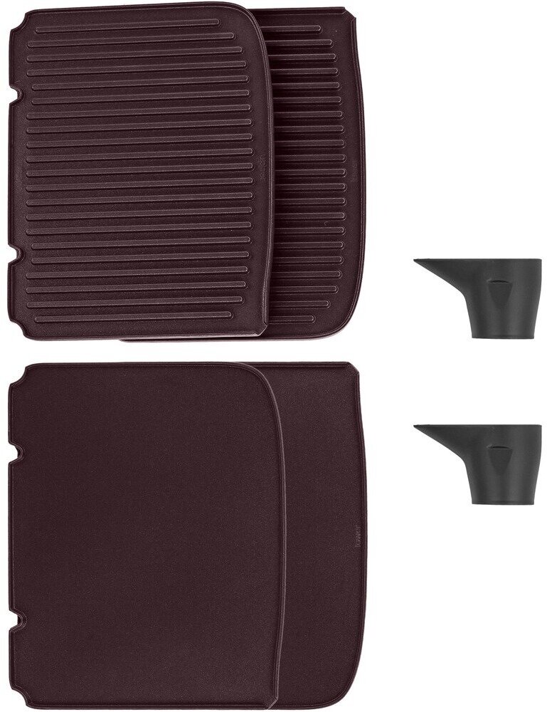 2 sets of grill plates and smooth surface, 2 containers for collecting fat, spatula; cable length 1.3 m; temperature control 80°-230°С