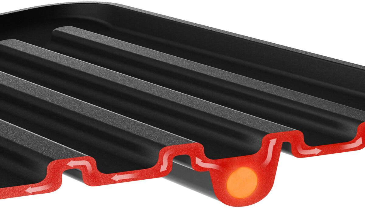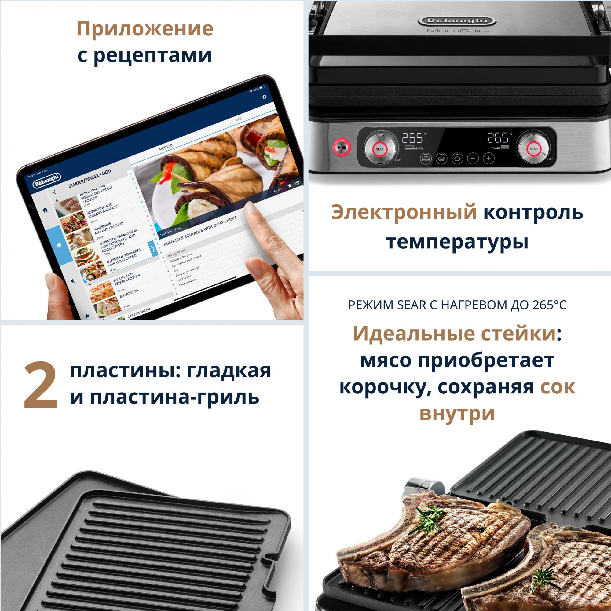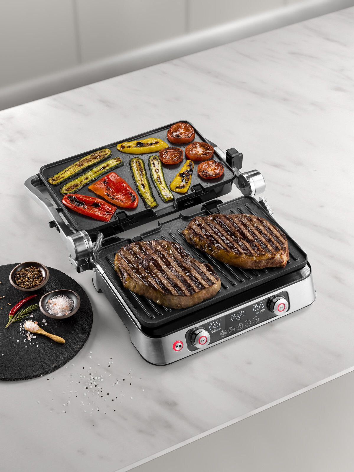 1 flat plate, 1 grill plate, cable length 1.3 m, temperature adjustment 220°-265°C, smartphone app; adjustable back legs; thermally insulated handles