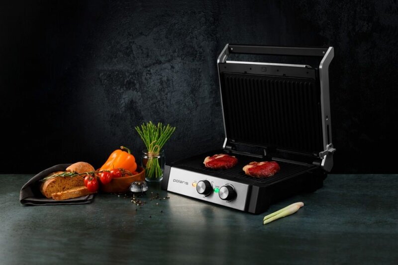 Non-stick coating, contact grill, drip tray, height adjustment of the top panel, removable plates