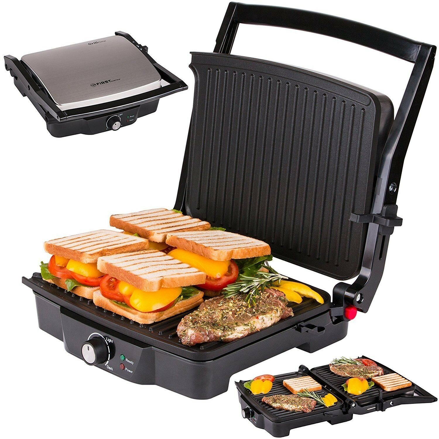 Type: grill, power: 2000 W, control: mechanical, features: non-stick coating, drip tray, 180° opening, additional functions: the ability to use the top panel as a standalone,