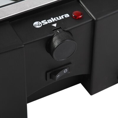 Double-sided grill pan/pan 35.5x21 cm; the possibility of grilling a frying pan and skewers at the same time; automatic rotation of skewers; removable stand for skewers; Maximum temperature -