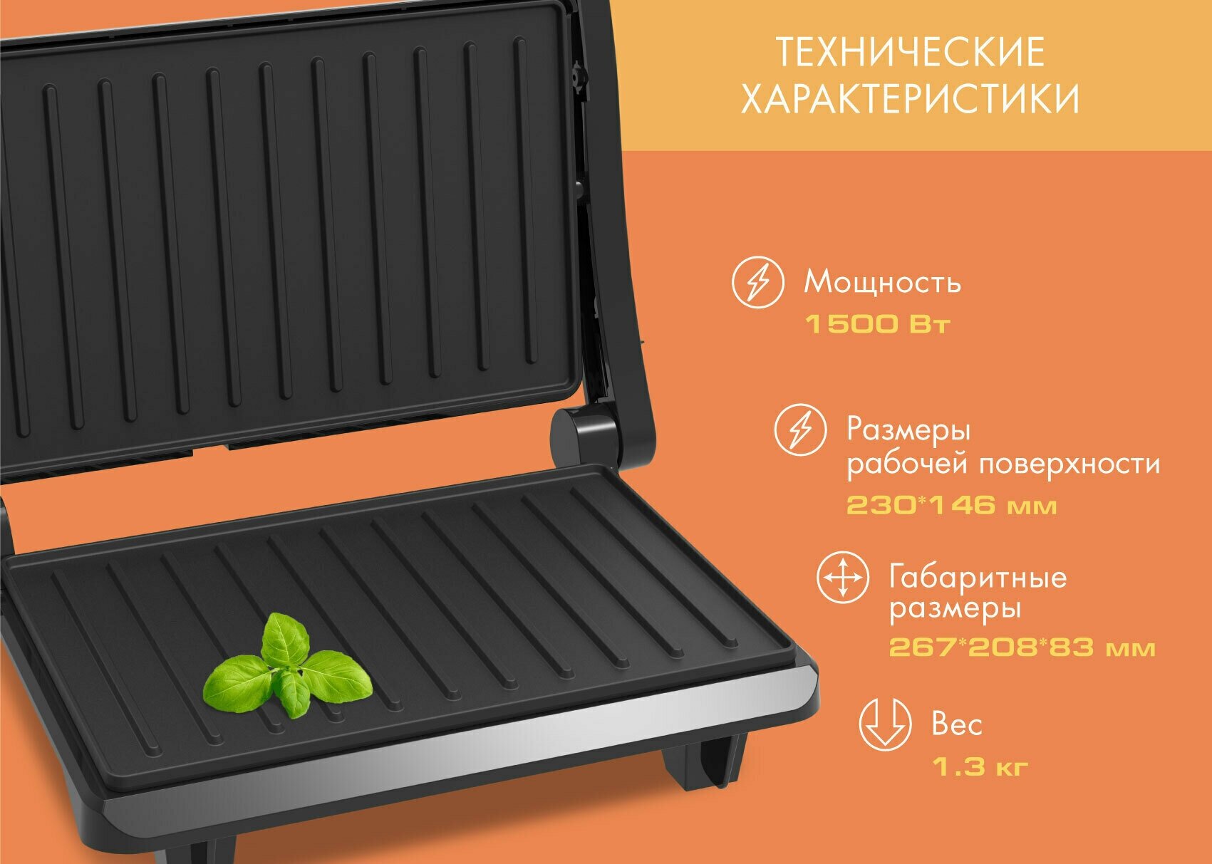 Working surface dimensions 23x14.6 cm, non-heating ergonomic handle, cord storage compartment; rated voltage: 220V, 50Hz