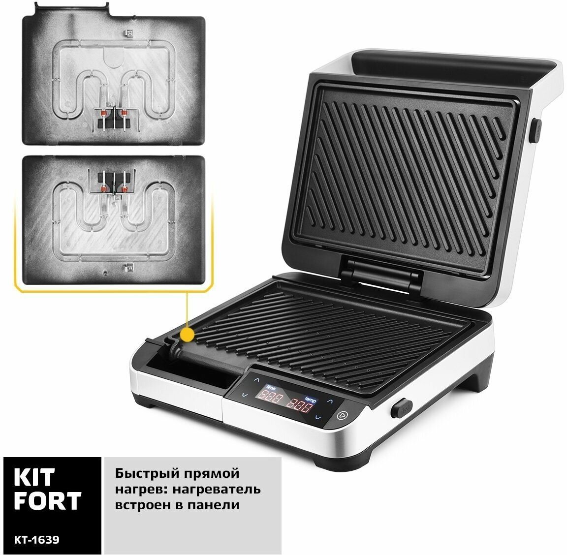 Removable panels 29 x 20 cm, automatic adjustment mechanism for pieces of different thicknesses, temperature adjustment up to 220 °C, timer up to 9 minutes 50 seconds