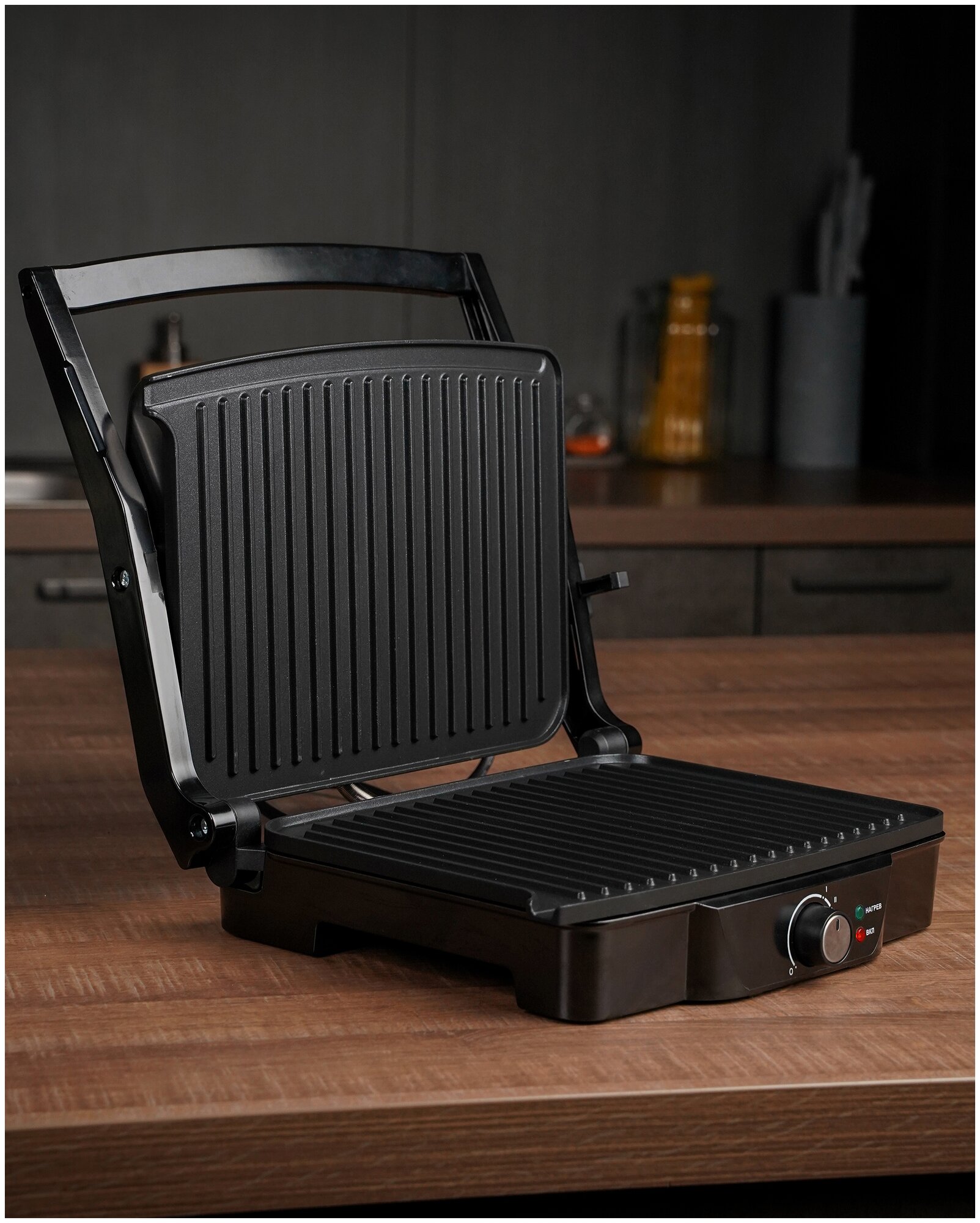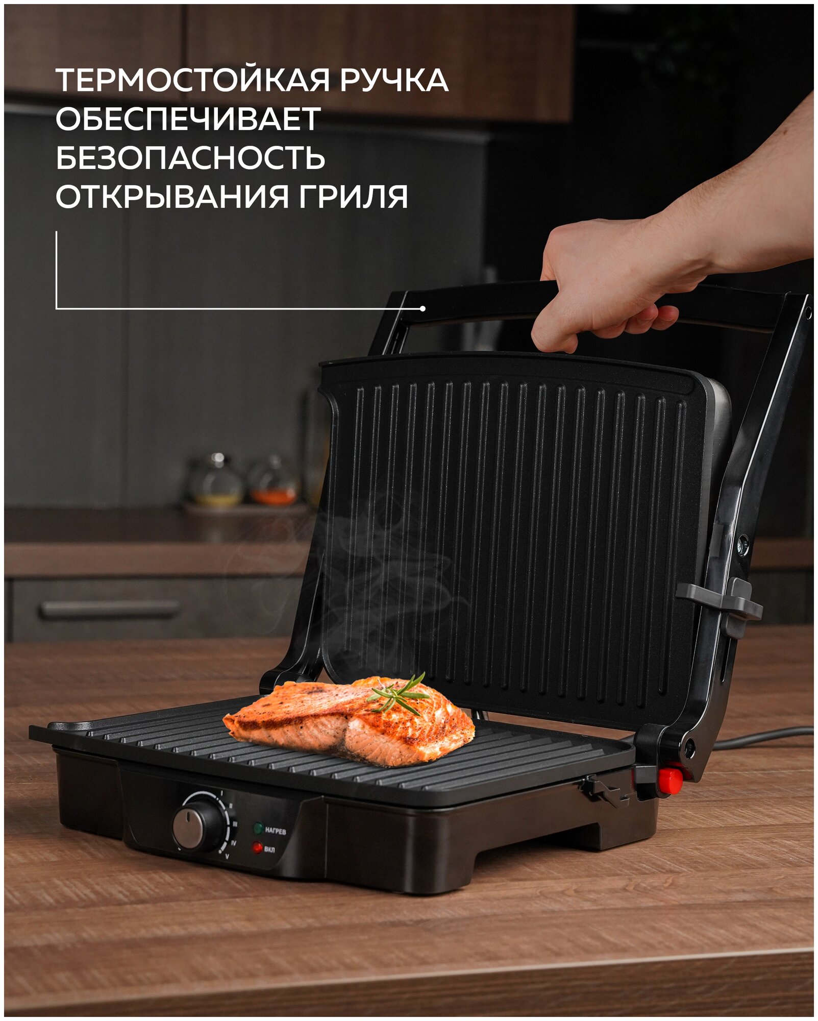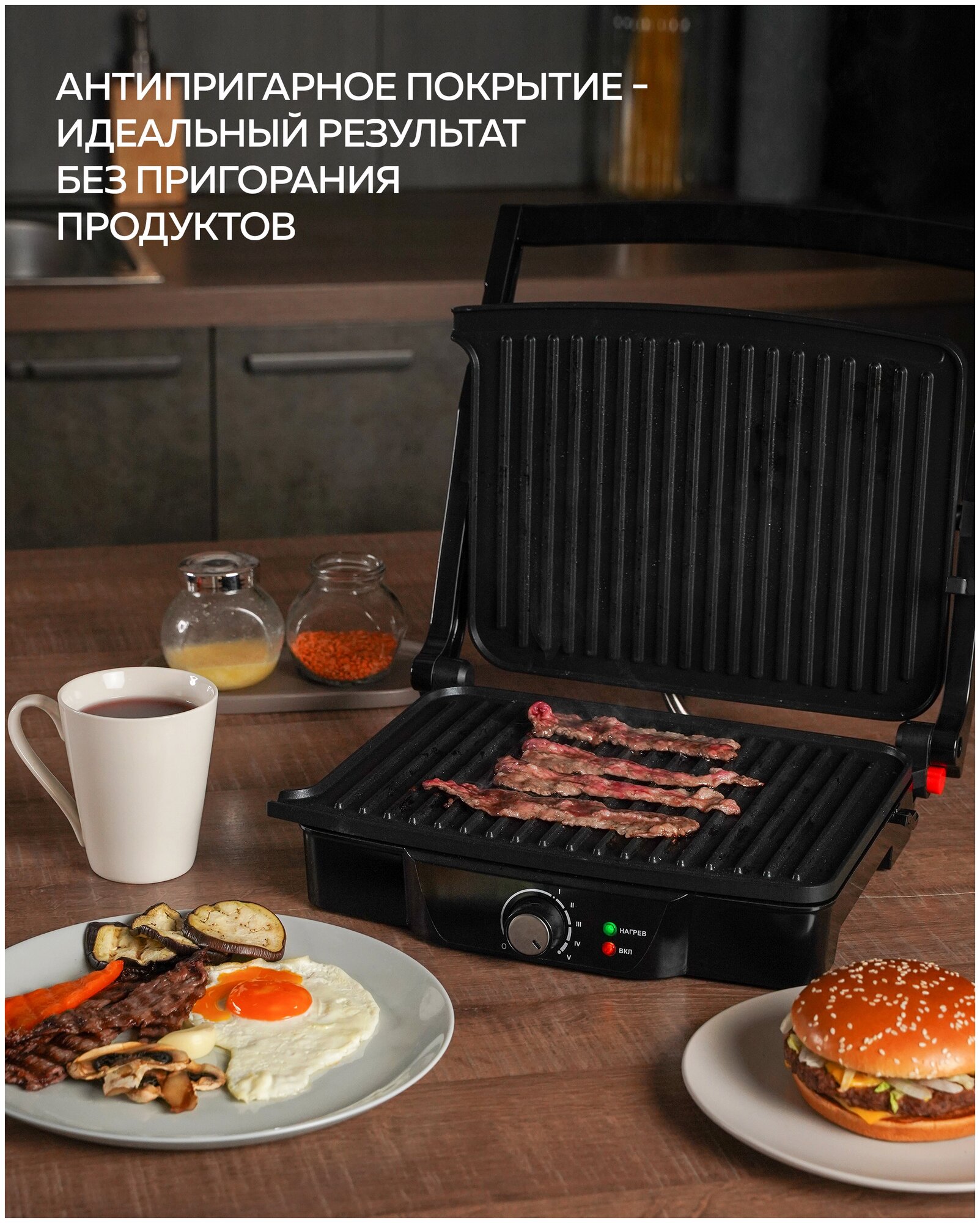 Type: grill, power: 2000 W, control: mechanical, features: non-stick coating, contact grill, fat collection tray, additional functions: the ability to use the top panel as an independent